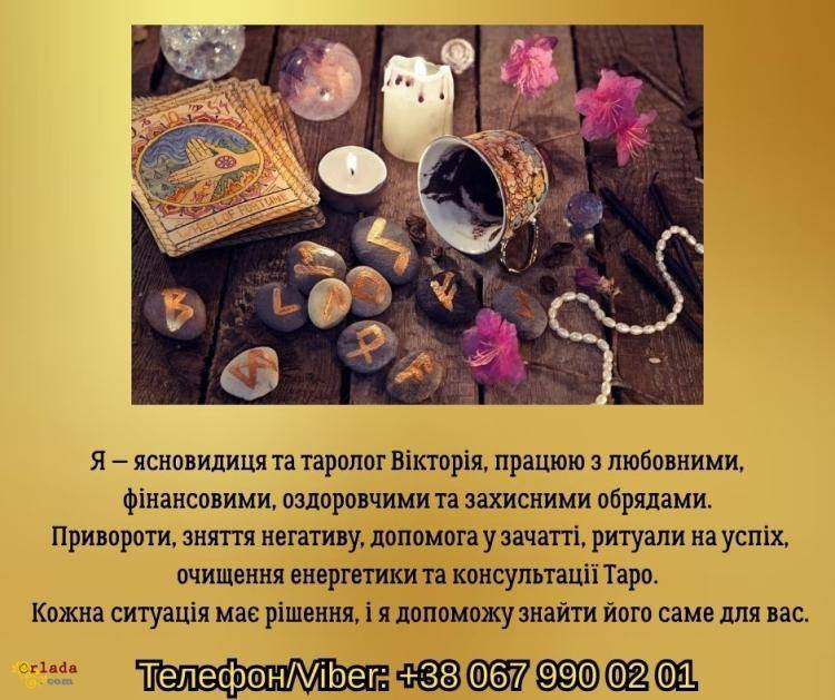 Мене звати Вікторія. Я ясновидиця, екстрасенс, рунолог і таролог. Вже багато років я допомагаю людям знаходити відповіді на найскладніші питання, змінювати долю і відкривати нові шляхи до щастя.